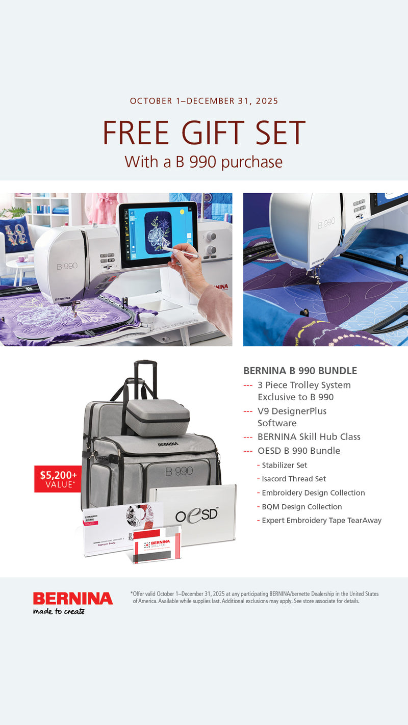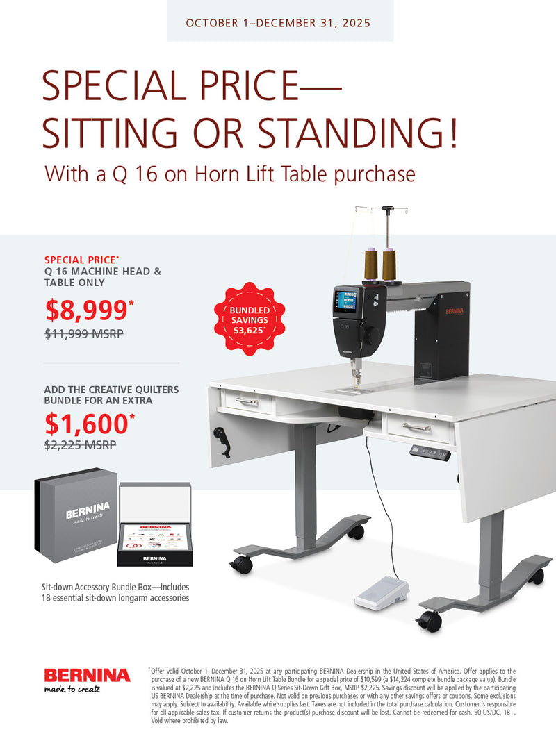 Take your quilting projects to the next level with our Bernina Q-Series sitdown free motion machine! Whether you're finishing a quilt or experimenting with free-motion designs, enjoy precision and ease with this top-of-the-line equipment. You can rent time on our Bernina Q16 with the lift table.