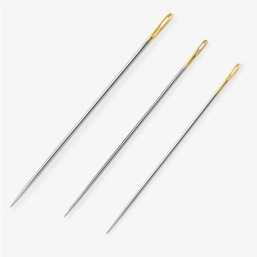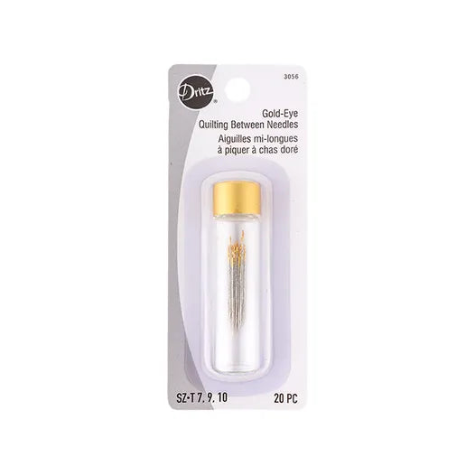 Gold-Eye Quilting Between Needles have a small round eye for hand-quilting thread with a gold eye to enhance visibility for easier threading. The short shaft is perfect for detailed handwork and the sharp point penetrates quilt layers with ease. Package includes a total of 20 needles in sizes 7, 9 and 10 in a glass storage tube.