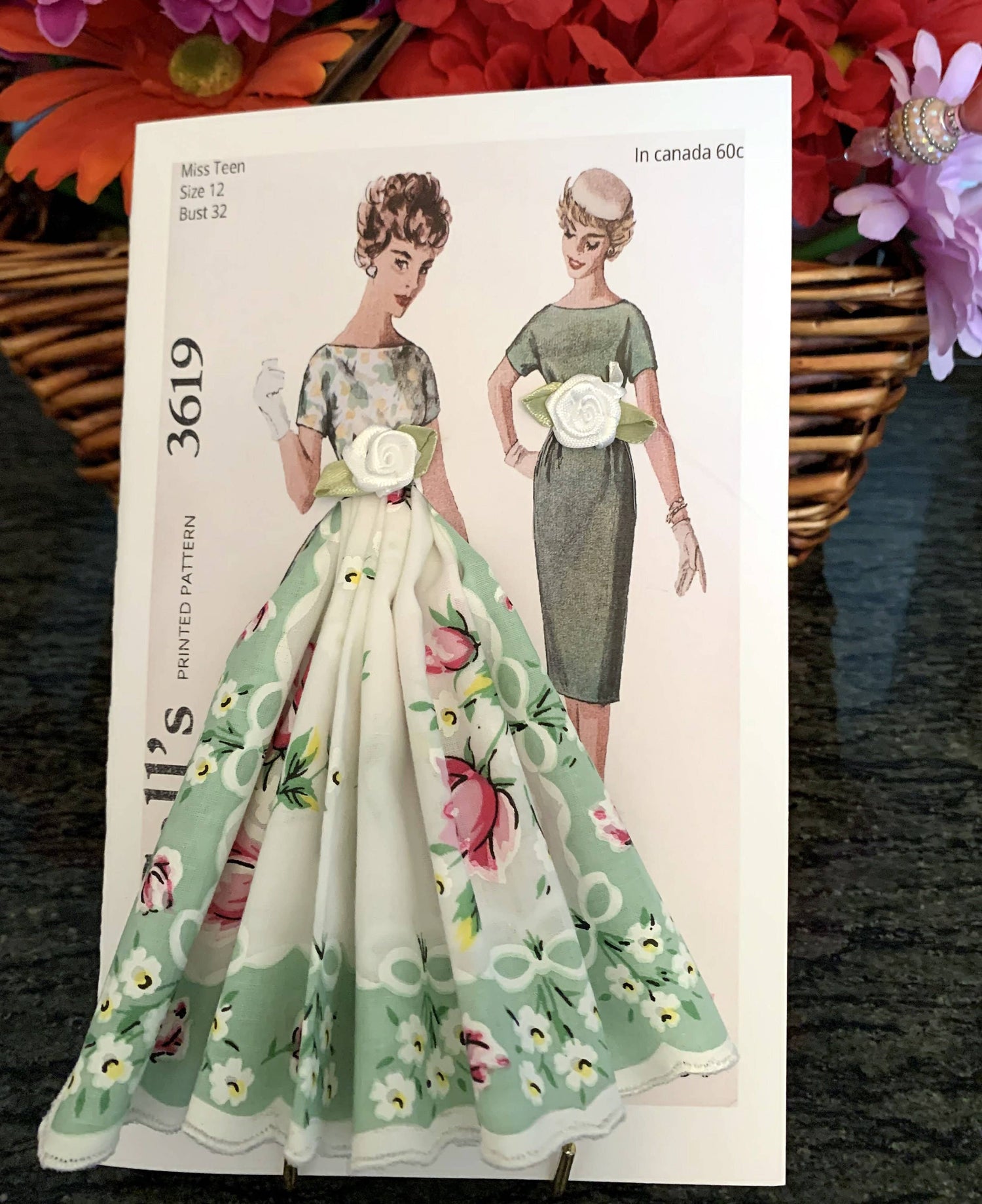 Fashion Ladies Keepsake Hankie Cards. Simplicity 6924, Pretty in Pink, Butterick 3592, Pretty in Blue, McCall's 3619 Pretty in green. 5.5" W x 8.5. Envelope Included, Hankie is 100 percent cotton. Removable and Washable. Accessories and/or flowers may be substituted depending on availability. Simplicity Pink Hankie is sold out and is being replaced with another beautiful hankie.