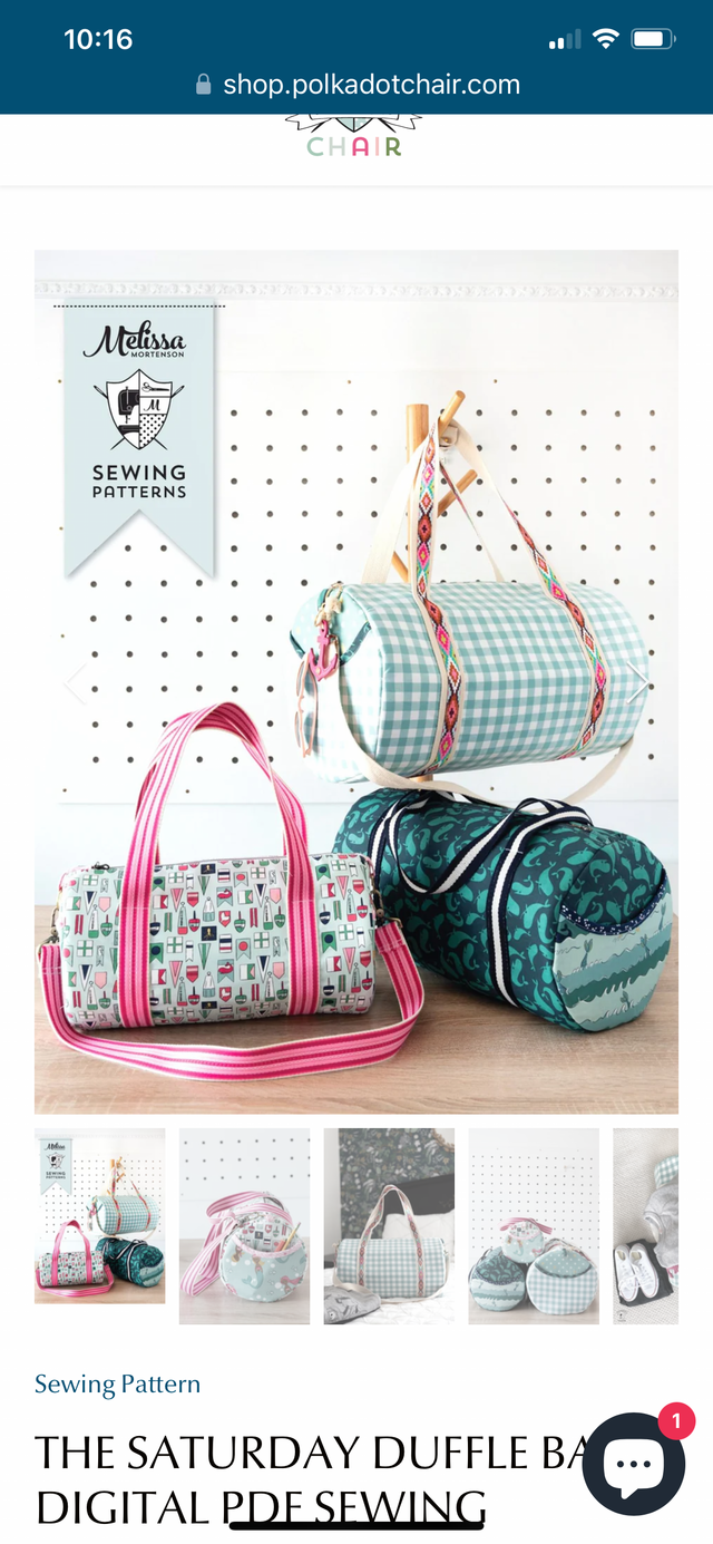 The Saturday Duffle bag sewing pattern is a pattern for a round, lined zippered duffle bag. It features an optional exterior pocket and a detachable shoulder strap. The pattern includes instructions to create the bag in 3 different sizes.