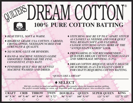 QUILTERS DREAM 100 % COTTON WHITE SELECT LOFT (1/8) BATTING 96 X 93 Double