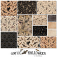 This fabric collection features an enchanting array of 5-inch squares perfect for Halloween-themed projects. Each square showcases a unique design, from eerie bats and skeletons to mystical potions and gothic elements, all set against a backdrop of subtle, moody tones. The designs are intricately detailed, capturing the essence of a gothic Halloween with a blend of dark charm and playful spookiness, making it ideal for quilters, crafters, and anyone looking to add a touch of the macabre to their creations.