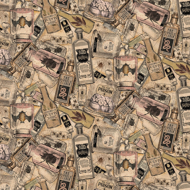 This fabric features a captivating design inspired by gothic Halloween themes, showcasing a variety of potion bottles, poison labels, and eerie imagery like bats and spiders. The intricate pattern is set against a vintage, parchment-like background, creating a mysterious and enchanting atmosphere perfect for crafting projects that need a touch of the macabre.