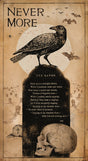 This enchanting fabric panel features a hauntingly beautiful design inspired by Edgar Allan Poe's "The Raven." The artwork showcases a large, detailed raven perched atop a gravestone with the poem's text inscribed on it, set against a backdrop of a full moon and a graveyard scene. The design is framed with the words "NEVER MORE" at the top, adding to the gothic atmosphere. Perfect for Halloween decorations, literary enthusiasts, or anyone who appreciates dark, romantic aesthetics