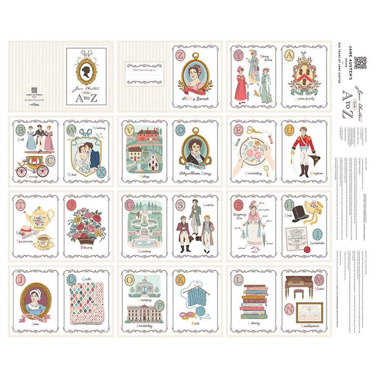 The Jane Austen soft book panel celebrates 250 Years of Jane Austen. The panel includes pieces and instructions to make an A to Z soft book that features images from the life and works of Jane Austen. Panel size is 35 1/2" x 43". Official licensed product.