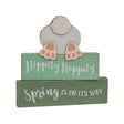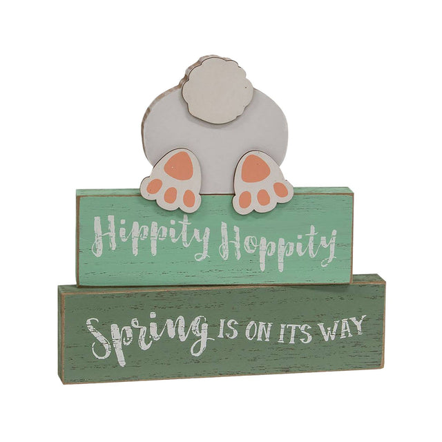 The Hippity Hoppity Bunny Blocks are a set of three decorative wooden blocks made to be displayed freestanding on a tabletop, whether stacked together or displayed separately. The largest block is painted in a neutral, distressed sage-green color, reads “Spring is on its way” in scripted white letters, and measures 2” high by 7.25” wide by .75” deep. The second block is painted in a distressed seafoam green color, reads “Hippity Hoppity” in white scripted letters, and measures 2” high by 6” wide by .75” deep. The third block is cut out into the shape of a bunny bum, painted white with bunny feet and tail details, and measures 3” high by 2.5” wide by .5” deep.