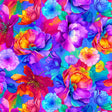 This vibrant fabric showcases a stunning array of multicolored floral designs, with flowers in shades of pink, purple, blue, orange, and red set against a dynamic, colorful background. The floral patterns are intricately detailed, creating a lively and eye-catching effect that is perfect for adding a splash of color to any project, whether for fashion, home decor, or crafting.