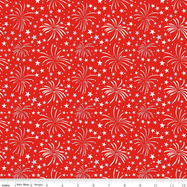 Firecracker by My Mind's Eye for Riley Blake Designs is great for quilting, apparel and home decor. This print features scattered stars, dots, and starbursts.