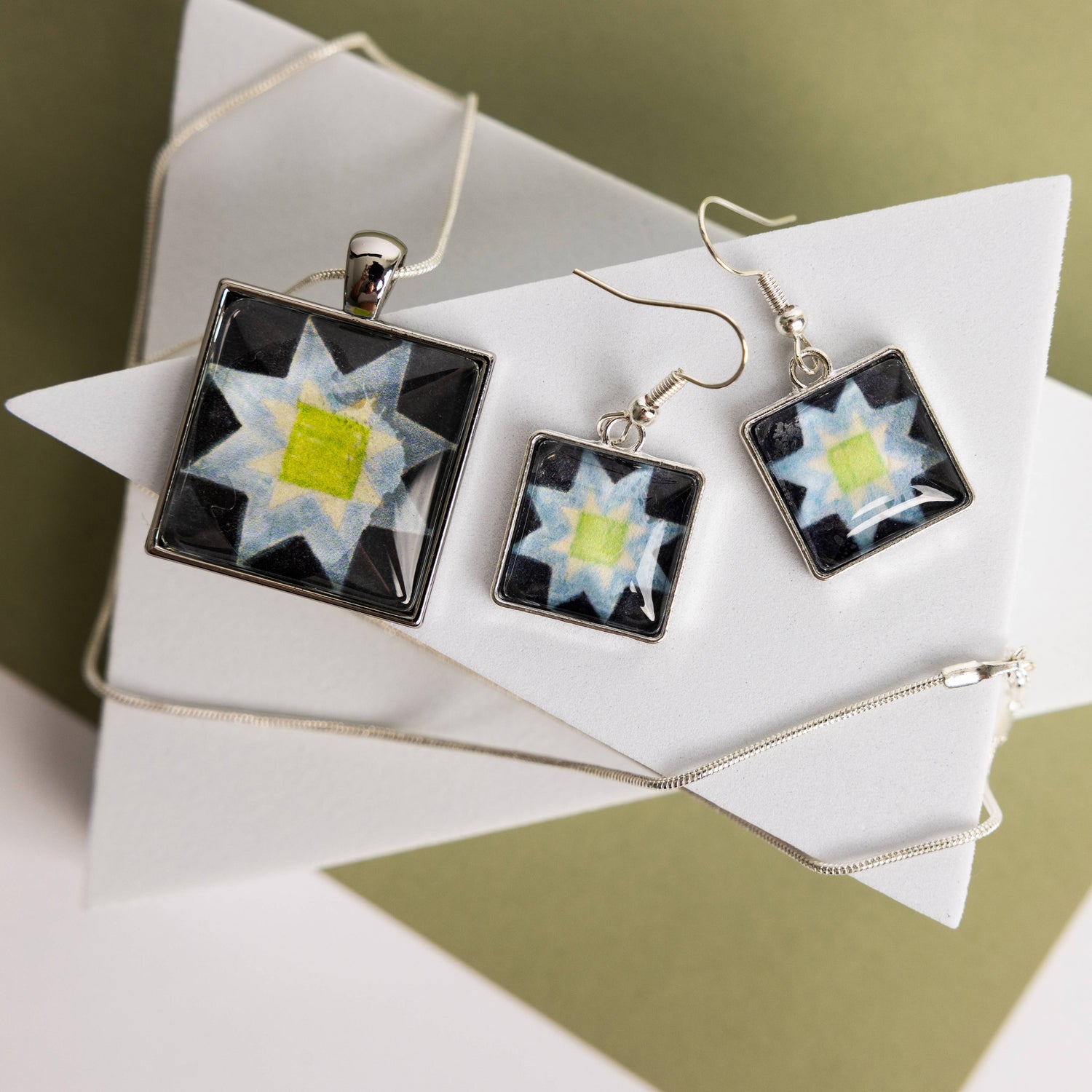 Silver 16mm Earrings for pierced ears. Original Design features shades of Black, Lime and Light Blue behind beveled crystal. Presented on Eco-friendly earring card. Also available in matching 25mm pendant with 18" silver chain. Pendant and Earrings are sold separately.