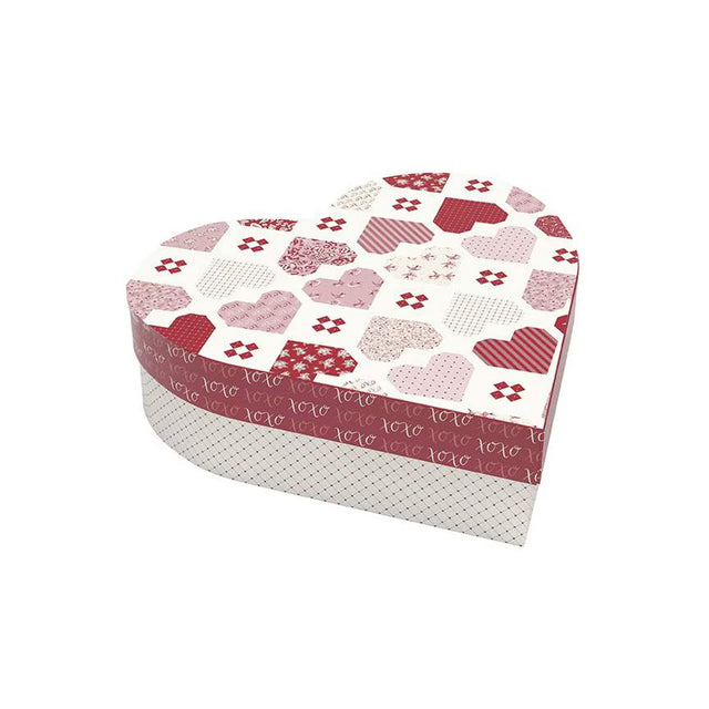 The Heartwarming Quilt Kit includes pattern and fabric for quilt top and binding. Backing not included. Fabric featured is Letters to Cupid by My Mind's Eye. Pattern is by Wendy Sheppard. Finished size is 52" x 52". Kit comes in a keepsake box. Box size is approximately 11 1/2" x 11 1/2" x 3 1/4".