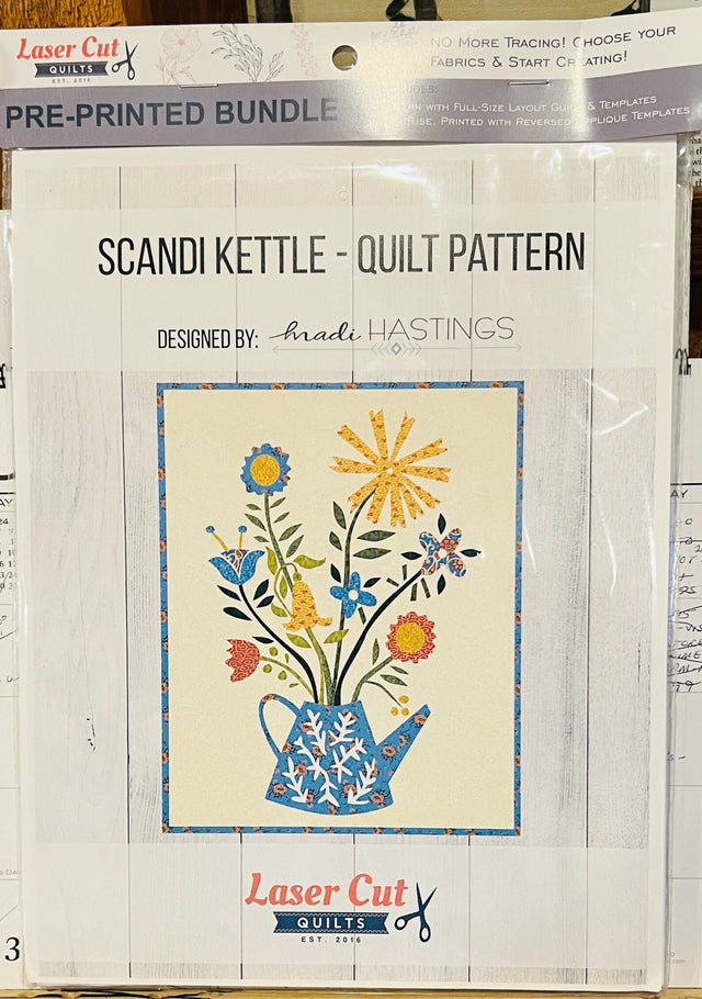 "Scandi Kettle," designed by Madi Hastings, features wildflowers growing in a folk art kettle. A perfect year-round wall hanging. Kit these for your customers with bolt remainders, fat eighths, or submit a custom request for laser-cutting in your own colorway with fabrics from your very own quilt shop! (12 kit minimum).