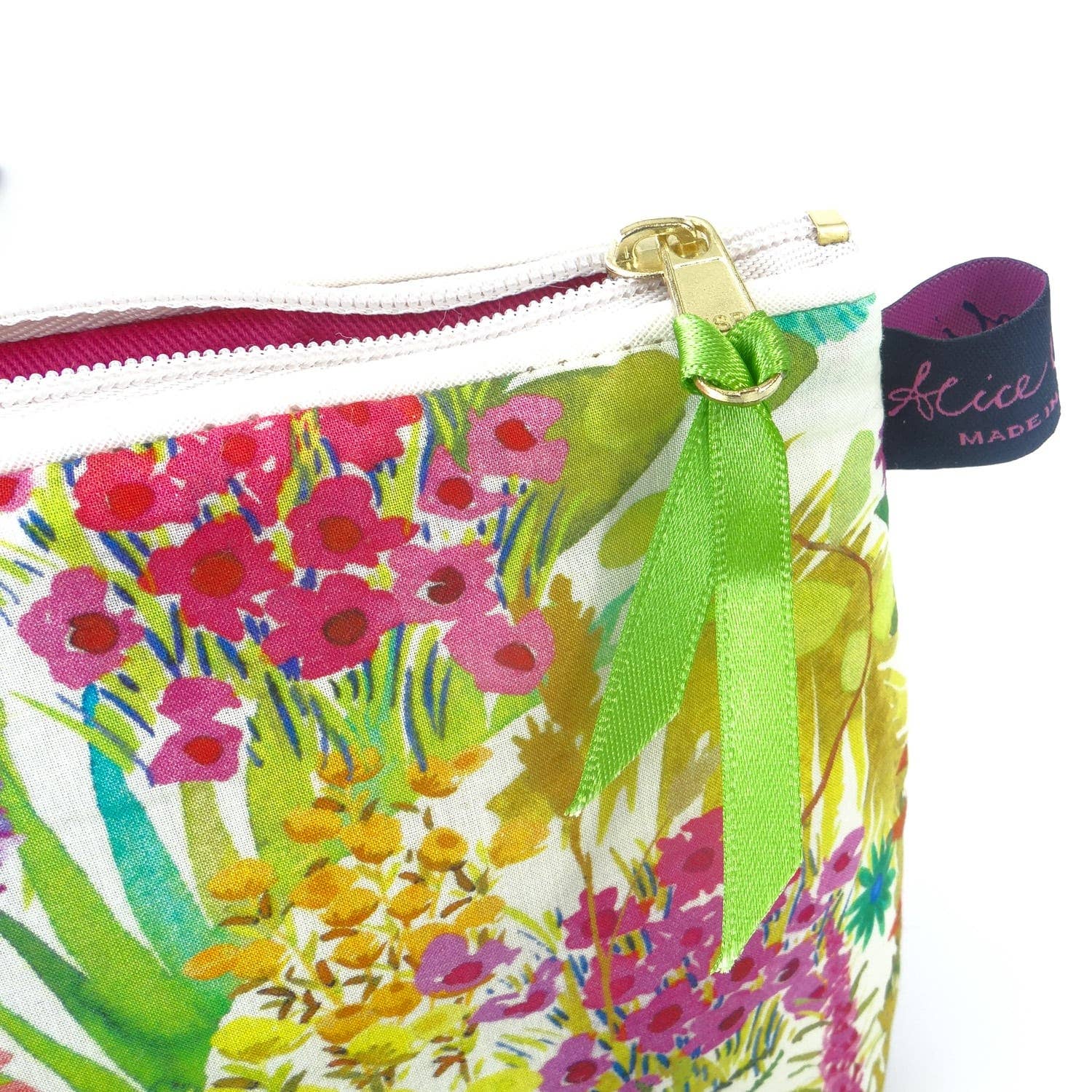 Uncoated fabric with a padded layer, it feels beautiful to the touch. Lined with a fabulous hot pink fabric and finished with a satin ribbon zip pull.