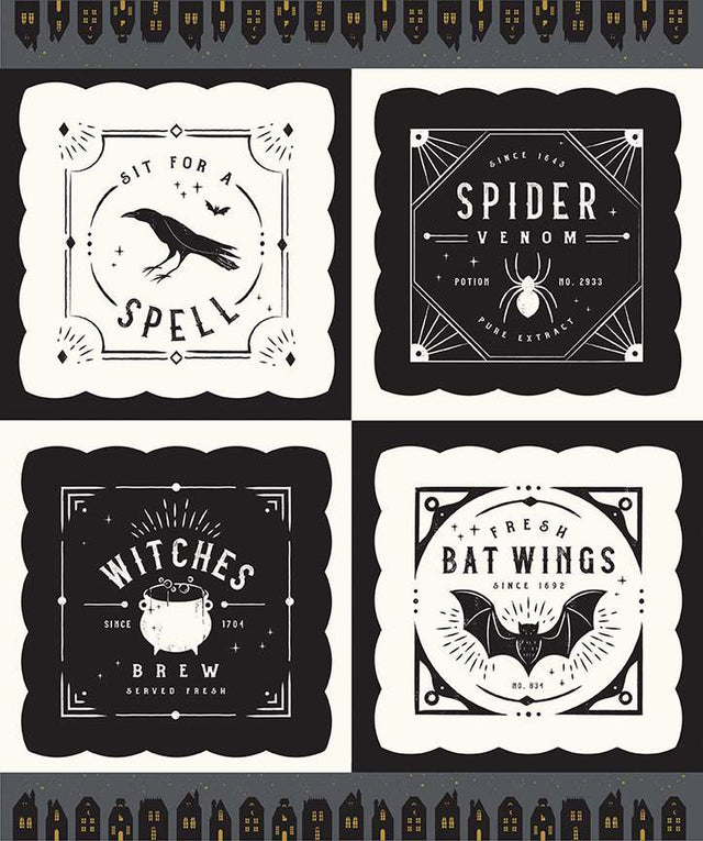 Sophisticated Halloween by My Mind's Eye for Riley Blake Designs is great for quilting, apparel and home decor. This panel features a patchwork with four Halloween-themed images and is bordered by houses on the top and bottom. Panel size is 36" x 43"