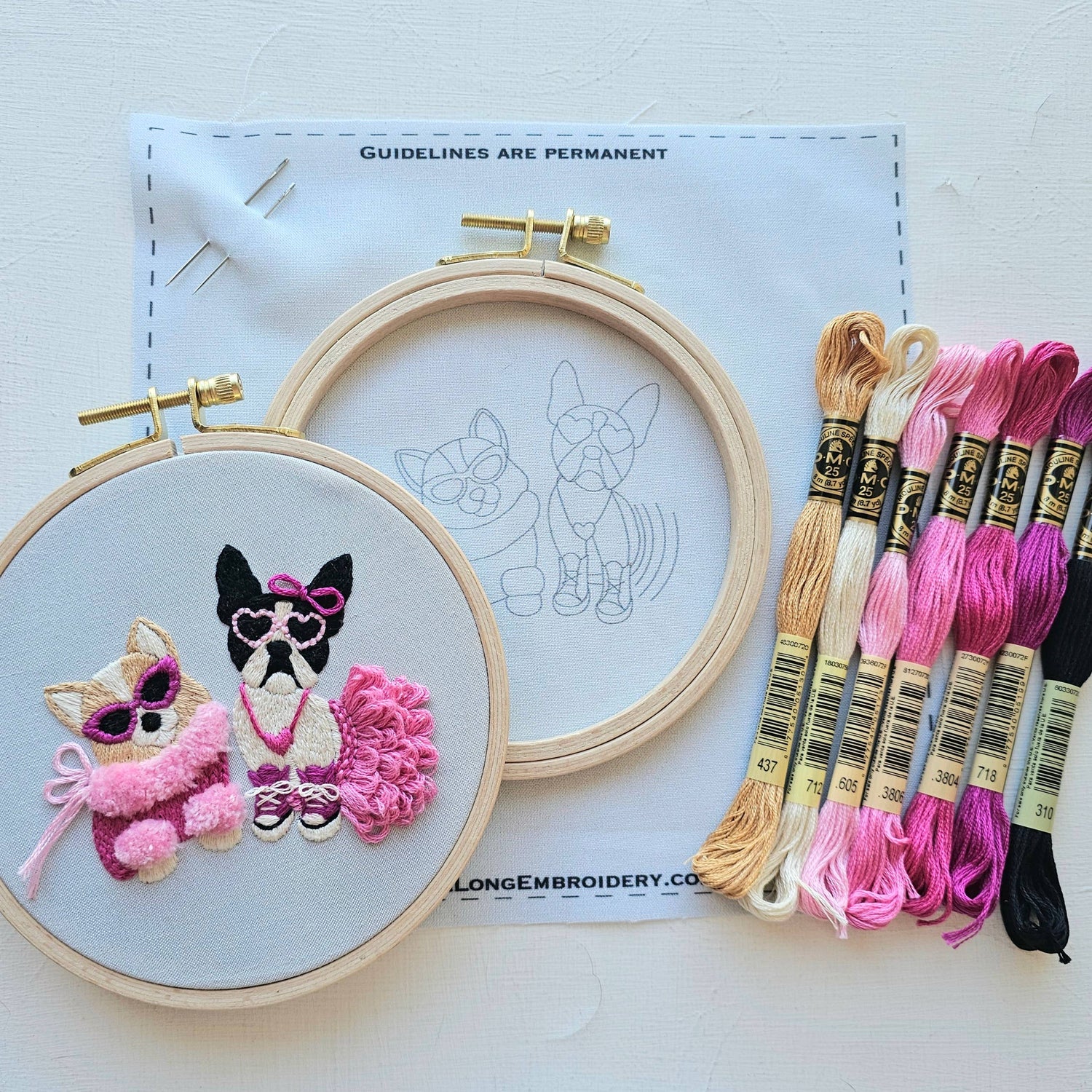 This kit includes the quality hand embroidery supplies needed to stitch this sassy corgi and her Boston terrier friend.