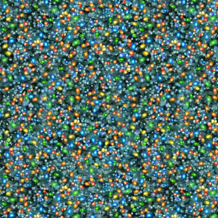 This vibrant fabric features a festive design with a multitude of colorful Christmas lights scattered across a dark background, creating a lively and celebratory atmosphere. The pattern includes lights in shades of red, green, blue, yellow, and orange, which are densely packed to give a sparkling effect, perfect for holiday-themed projects or adding a touch of festive cheer to any creation.