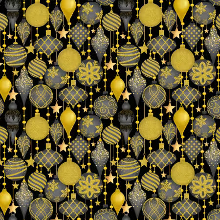 This festive fabric showcases a delightful array of Christmas ornaments in a striking pattern. The design features a mix of yellow and black ornaments, each intricately detailed with various patterns like stars, stripes, and swirls, all set against a deep black background. The ornaments are arranged in a cascading manner, creating a visually rich and festive look perfect for holiday crafting, apparel, or home decor projects.