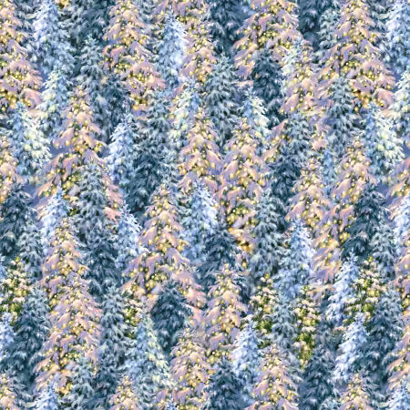 This enchanting fabric captures the essence of a winter wonderland with its depiction of evergreen trees adorned with delicate icicles and twinkling Christmas lights. The design features a harmonious blend of cool blues, soft whites, and gentle pinks, creating a serene yet festive atmosphere. Perfect for holiday crafting, this fabric brings the magic of a snowy Christmas forest into your projects, whether for creating festive garments, home decor, or unique gifts.
