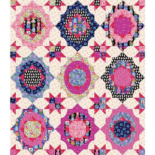 Filled with whimsy, enchantment and hidden surprises all with a modern flair. The Cameos Quilt Kit includes pattern from Tara Lee Quiltery and all the fabrics needed for the top and binding from the Hello Alice collection by Sarah Watts of Ruby Star Society. Prints feature curious hares, tea parties, smiling cats and Alice herself all in a color palette of pinks, berry, purples and cream. Finished size is 60" x 69"