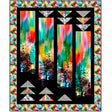 A positive/negative style tree scenic with Aurora Borealis type sky stars in a single border print. Complimented by abstracts and geos in this striking ensemble of vivid prints. A pre-printed tote panel project is also available in this collection. ©QT Fabrics