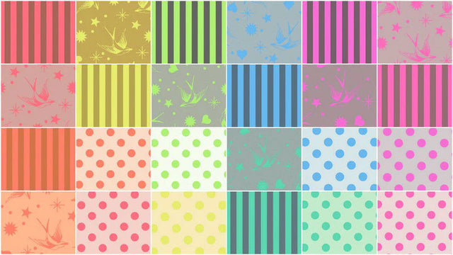 Colorful 2.5" strips of large playful dots, stripes, swallows, stars, and much more. Show your true colors with this vibrant collection! True Colors by Tula Pink for Free Spirit Fabrics is a dazzling collection of basic and bold in captivating neon colors. You'll see stripes, polka dots, swallows, stars, and more in this totally Tula collection!