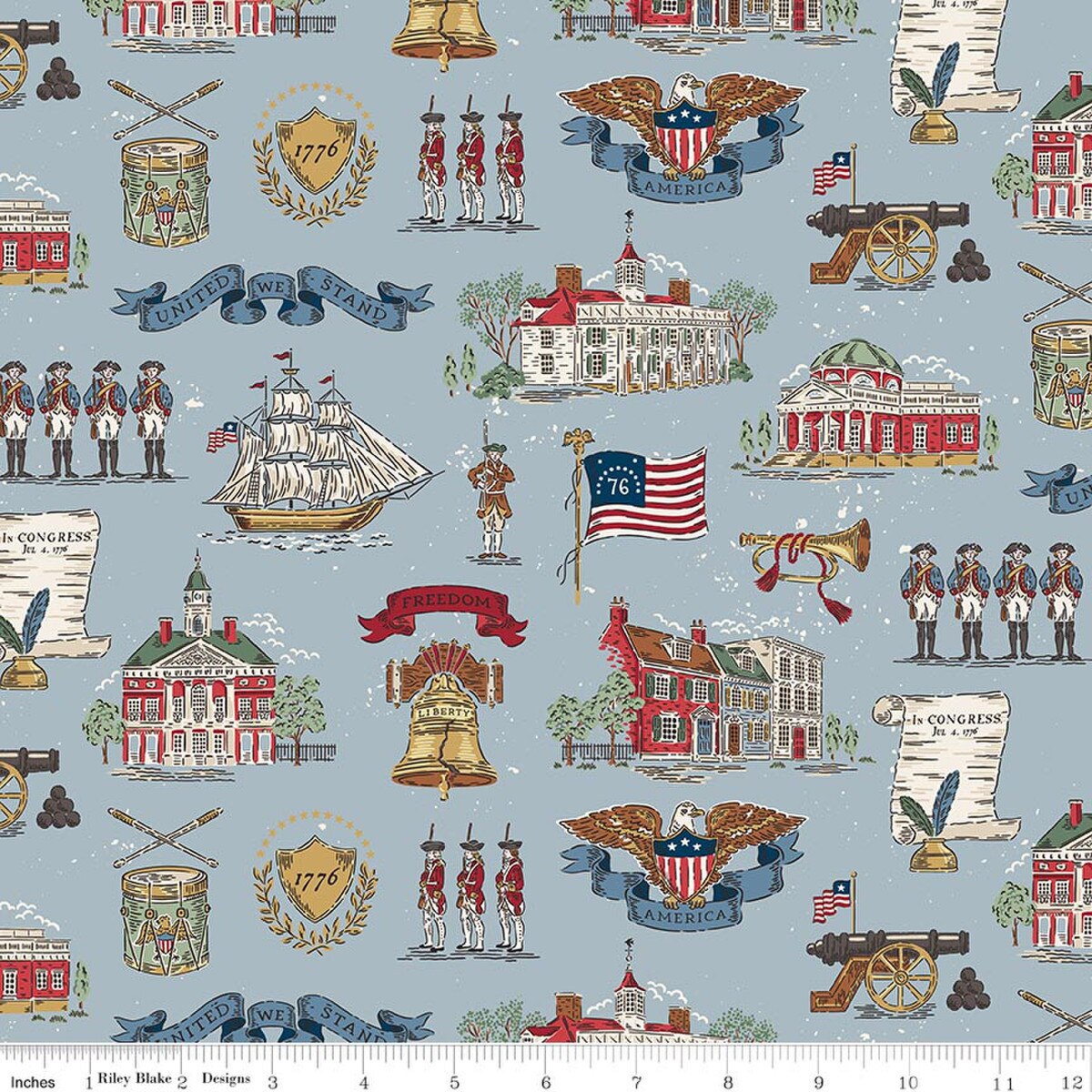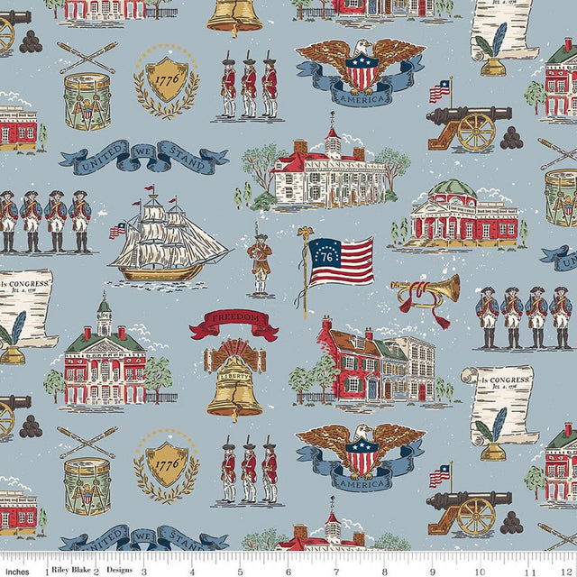 Independence by the RBD Designers for Riley Blake Designs is great for quilting, apparel and home decor. This print features images from colonial America and commemorates the 250th anniversary of the signing of the Declaration of Independence.