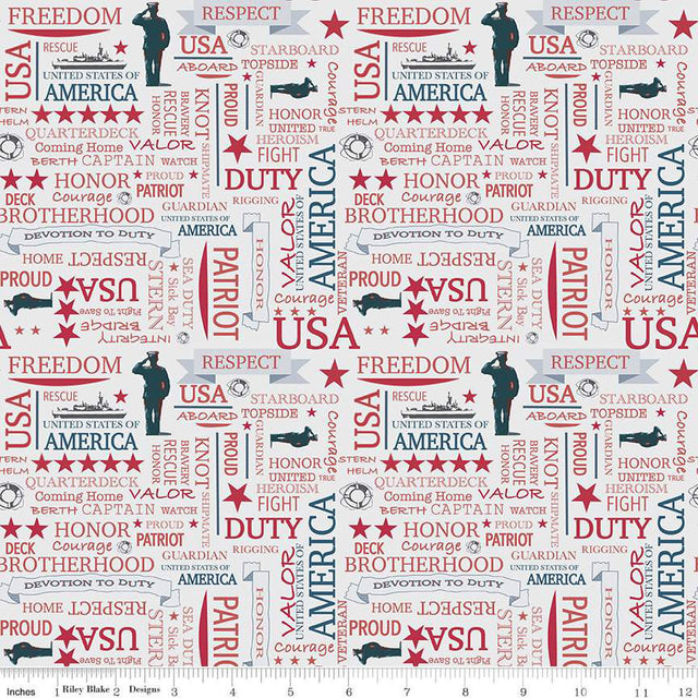 Riley Blake Coming Home Coast Guard Text Silver, by the yard is backordered and will ship as soon as it is back in stock.