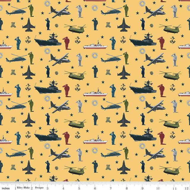 Riley Blake Coming Home Armed Forces Main Yellow by the yard
