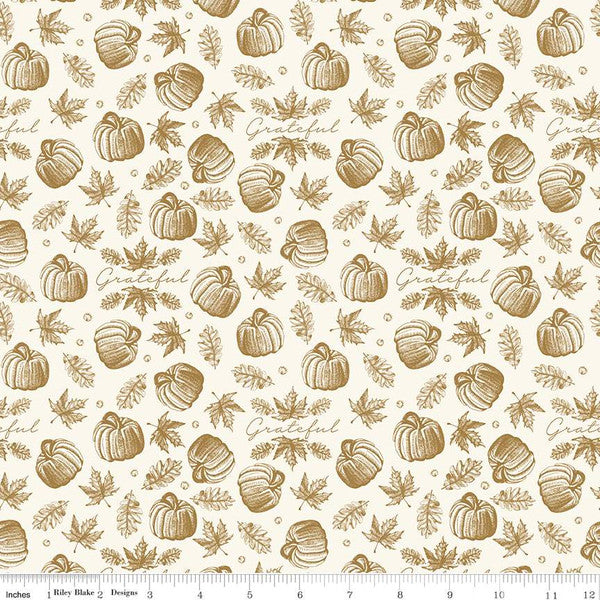 Shades of Autumn by My Mind's Eye for Riley Blake Designs is great for quilting, apparel and home decor. Shades of Autumn by My Mind's Eye for Riley Blake Designs is great for quilting, apparel and home decor. This print features pumpkins, leaves, and "grateful." Gold is gold sparkle.