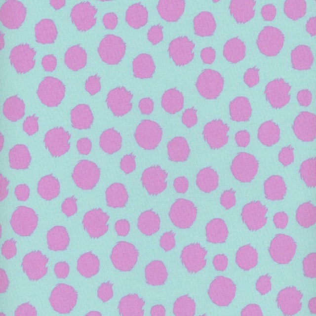 Embark on a whimsical journey into the feline-inspired wonderland of Tabby Road, a vibrant fabric collection by the renowned Tula Pink for FreeSpirit Fabrics. Embrace the joyful whimsy of playing with your feline friend with this bright aqua fabric featuring scattered fuzzy purple dots.