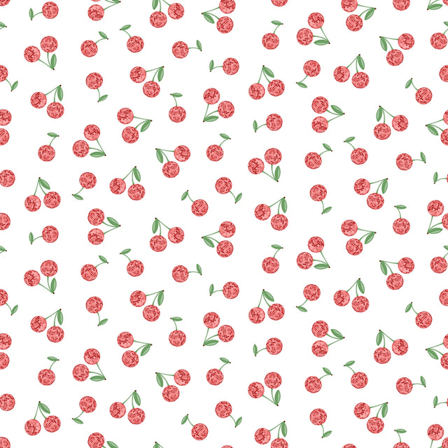 This fabric features a delightful design of white cherry disco balls scattered across a clean white background, evoking a fun and festive atmosphere. The cherries are depicted with a glittery finish, adding a touch of sparkle to the overall look, while the green stems and leaves provide a vibrant contrast. Ideal for projects that require a playful yet elegant touch, this fabric's quality and design make it suitable for a variety of applications, from fashion to home decor.