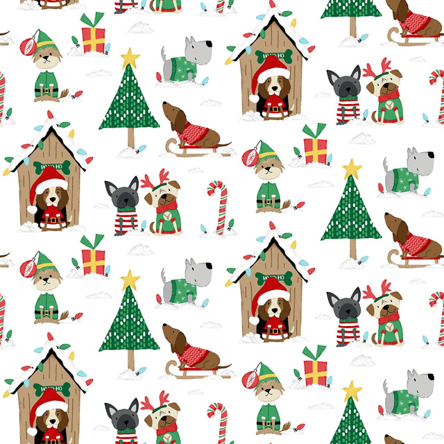 This delightful fabric features a whimsical white background adorned with a festive array of holiday-themed dogs. The design includes adorable dogs dressed in Christmas attire, such as sweaters and Santa hats, engaging in playful holiday activities. Scattered throughout the pattern are elements like Christmas trees, presents, and candy canes, all contributing to a cheerful and festive atmosphere. This fabric is perfect for creating holiday-themed crafts, apparel, or home decor, bringing a touch of joy and festivity to any project.