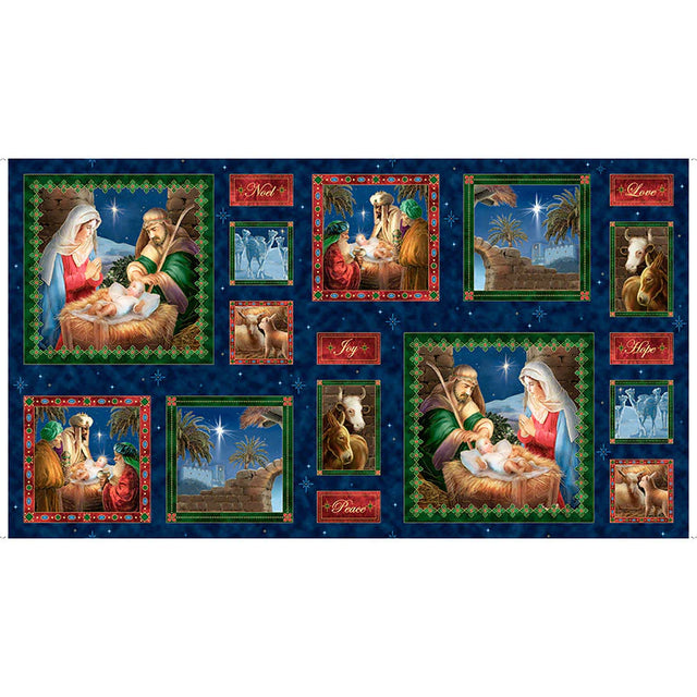 Christmas Eve is illustrated in striking detail and dramatic color in this Born in Bethlehem-Nativity Patch Navy Panel by Menga for Quilting Treasures. The vivid detail alone makes this depiction of Christ's birth makes this panel stand apart.